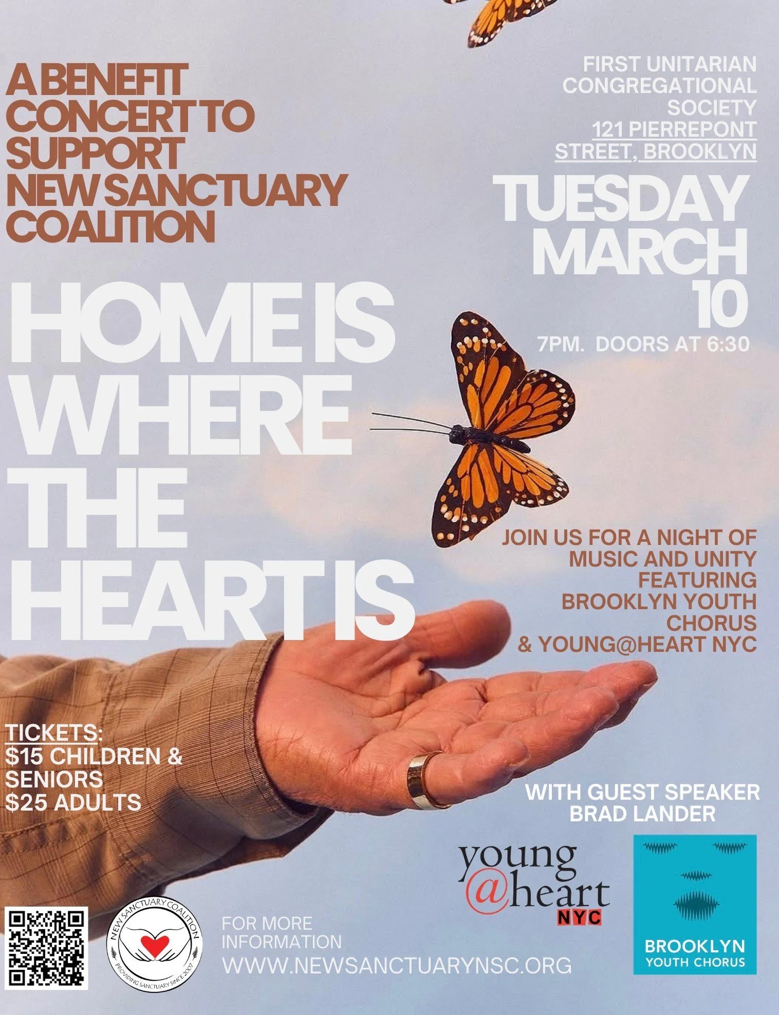 “Home Is Where the Heart Is” is more than just a concert—it’s a celebration of the sanctuary we find in one another. We are thrilled to share the stage with Young@Heart NYC for their highly anticipated live debut performance, bridging generations through the universal language of song. Together, we’ll be raising our voices to support New Sanctuary Coalition’s vital mission: keeping families together and advocating for our immigrant neighbors.